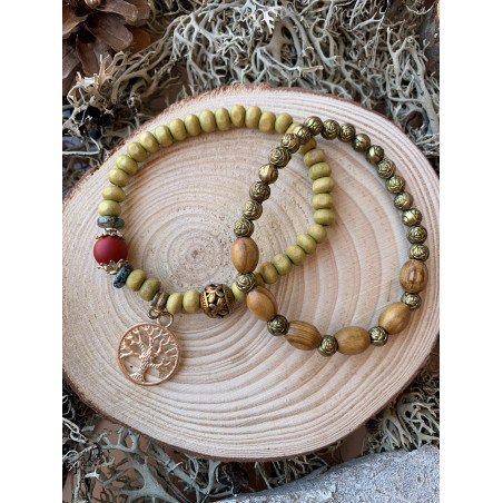 Conjunto de dos pulseras con abalorios de madera, con placa del árbol de la vida.